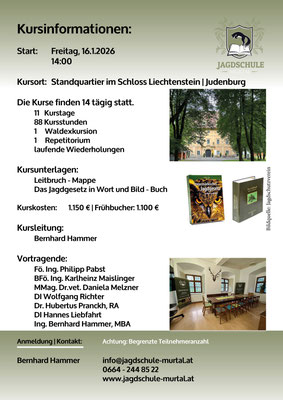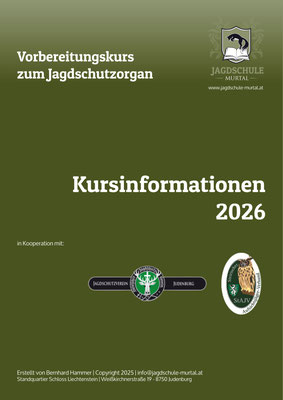 In diesem Kurs werden Sie umfassend auf die Prüfung zum steirischen Jagdschutzorgan vorbereitet. Unsere hoch-qualifizierten Vortragenden geben Ihr Wissen an Sie weiter. In mehr als 100 Unterrichtseinheiten erhalten Sie das Rüstzeug, um bestens vorbereitet zur Prüfung anzutreten. Die Vorträge erfolgen in unserem Standquartier und werden an Freitagen und Samstagen abgehalten. Neben den Vorträgen haben wir die unten angeführten und inkludierten Leistungen: